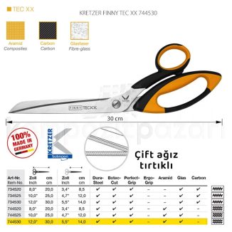 Almanya’nın lider makas üreticisi Kretzer firmasının Solingen çeliği kullanarak özel olarak kompozit sektörü için geliştirdiği Finny Tech XX makaslar; cam, karbon ve aramid elyafların rahatlıkla kesilmesini sağlar.