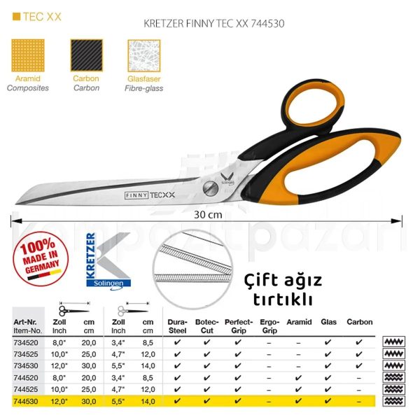 Almanya’nın lider makas üreticisi Kretzer firmasının Solingen çeliği kullanarak özel olarak kompozit sektörü için geliştirdiği Finny Tech XX makaslar; cam, karbon ve aramid elyafların rahatlıkla kesilmesini sağlar. Sertleştirilmiş karbon çeliği sayesinde çok uzun yıllar problemsiz kullanım imkanı verir. Tutma bölümünün, kesici uca göre daha uzun olması, baskıyı etkin bir şekilde malzemeye iletirken, küçük oval bölgeleri hatasız kesebilmek için kontrolü artırır.