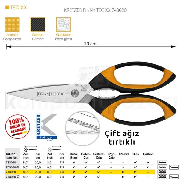 Almanya’nın lider makas üreticisi Kretzer firmasının Solingen çeliği kullanarak özel olarak kompozit sektörü için geliştirdiği Finny Tech XX makaslar; cam, karbon ve aramid elyafların rahatlıkla kesilmesini sağlar.