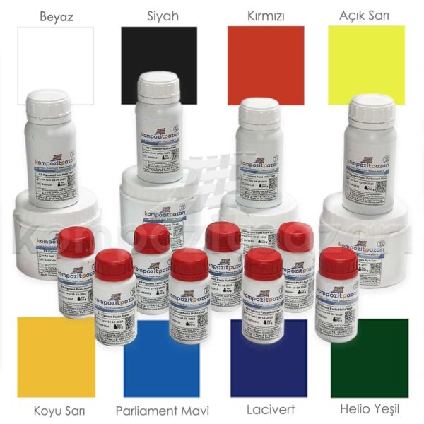 KP Pigment Pastalar, kompozit üretim süreçlerinde doğru renk, yüksek örtücülük ve stabil performans arayan profesyoneller için özel olarak geliştirilmiştir. Polyester, jelkot, vinil ester ve epoksi reçinelerle uyumlu yapısı sayesinde hem üretimde hem de tasarım aşamasında güvenle tercih edilir. Bu pigment beyazdan siyaha, sarı tonlarından mavi ve yeşile kadar geniş renk skalası ile farklı sektörlerin ihtiyaçlarına cevap verir. Hafif yapıları sayesinde reçinenin mekanik özelliklerini minimum düzeyde etkilerken, doğru oranlarda kullanıldığında yüzey kalitesini ve görsel bütünlüğü artırır. KP Pigment Pastalar, kalıp, tekne, otomotiv, inşaat ve endüstriyel kompozit uygulamalarında hem pratik kullanım hem de maliyet verimliliği sunarak üretim sürecini kolaylaştırır.